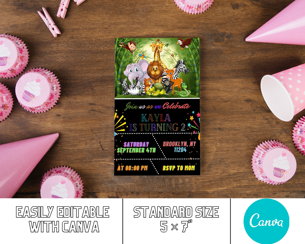 Editable Cute Animals Forest Birthday Invitation Card (Size : 5"×7")